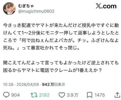 【画像】ヤマトの配達員、客に対してものすごい暴言を吐いてしまい炎上。これはどっちが悪いの?
