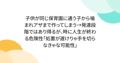 子供が同じ保育園に通う子から噛まれアザまで作ってしまう→発達段階ではあり得るが、時に人生が終わる危険性「処置が遅けりゃ手を切らなきゃな可能性」