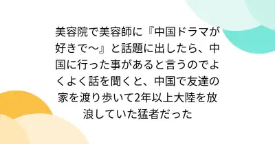 美容院で美容師に『中国ドラマが好きで~』と話題に出したら、中国に行った事があると言うのでよくよく話を聞くと、中国で友達の家を渡り歩いて2年以上大陸を放浪していた猛者だった