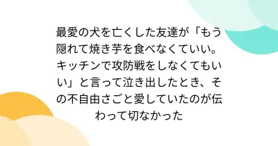 最愛の犬を亡くした友達が「もう隠れて焼き芋を食べなくていい。キッチンで攻防戦をしなくてもいい」と言って泣き出したとき、その不自由さごと愛していたのが伝わって切なかった