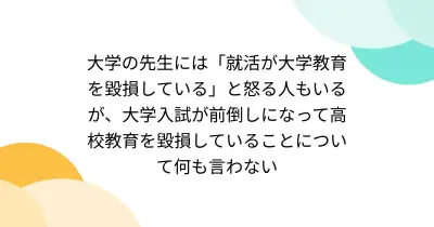 大学の先生には「就活が大学教育を毀損している」と怒る人もいるが、大学入試が前倒しになって高校教育を毀損していることについて何も言わない