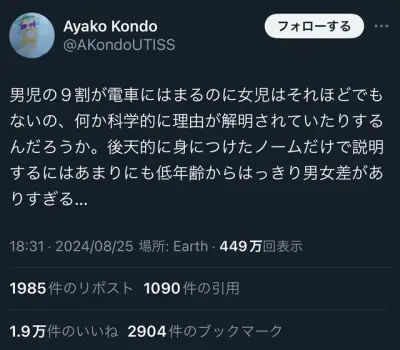 【悲報】X女性「男の9割は電車にハマった経験があるらしい。先天的になにかあるんだろう」←10万いいね