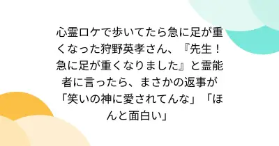 心霊ロケで歩いてたら急に足が重くなった狩野英孝さん、『先生!急に足が重くなりました』と霊能者に言ったら、まさかの返事が「笑いの神に愛されてんな」「ほんと面白い」