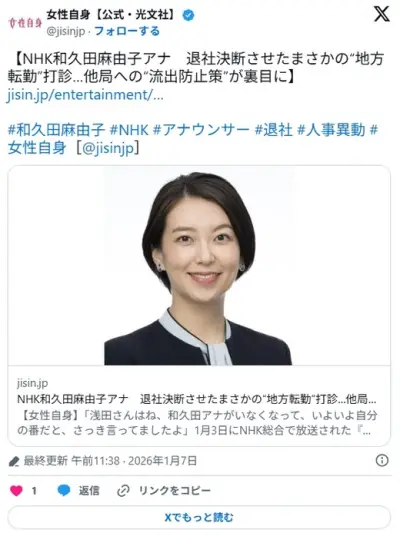 【闇深】NHK和久田麻由子アナ(37歳)「東大卒・帰国子女の私がなぜ地方局に左遷なの!」ブチギレ退社