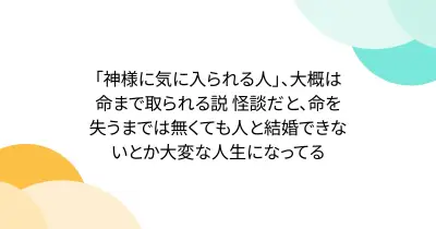 「神様に気に入られる人」、大概は命まで取られる説 怪談だと、命を失うまでは無くても人と結婚できないとか大変な人生になってる
