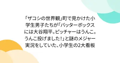 「ザコシの世界観」町で見かけた小学生男子たちが「バッターボックスには大谷翔平。ピッチャーはうんこ。うんこ投げました!」と謎のメジャー実況をしていた、小学生の2大看板