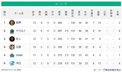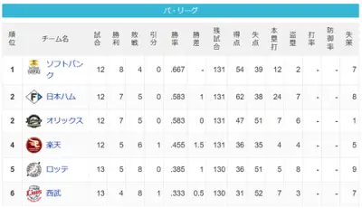 【4/10】パ・リーグ順位表|本日はお休み…日ハムの現在順位がこちら