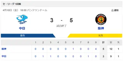 【試合結果】 4/10 中日 3-5 阪神 勝利目前松山打たれ痛恨の逆転負け