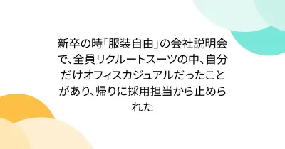 新卒の時「服装自由」の会社説明会で、全員リクルートスーツの中、自分だけオフィスカジュアルだったことがあり、帰りに採用担当から止められた