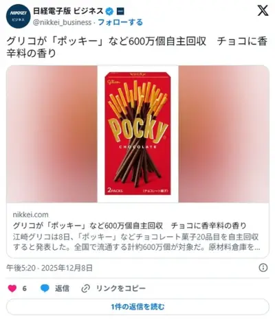 グリコが「ポッキー」など600万個自主回収 チョコに香辛料の香り
