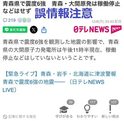 【震度6強】日テレが緊急事態に重大な誤報か「青森・大間原発は稼働停止などはせず」→大間原発は建設中で稼働しておらず