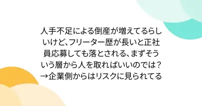 人手不足による倒産が増えてるらしいけど、フリーター歴が長いと正社員応募しても落とされる、まずそういう層から人を取ればいいのでは?→企業側からはリスクに見られてる