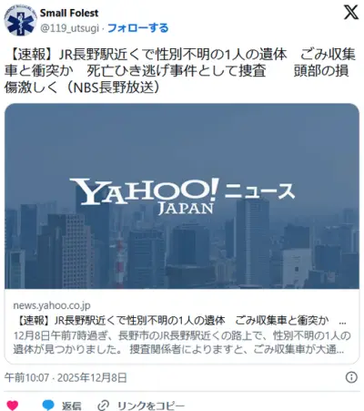 【長野】JR長野駅近くで性別不明の1人の遺体 “ごみ収集車”と衝突か 死亡ひき逃げ事件として捜査 頭部の損傷激しく