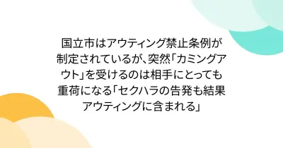 国立市はアウティング禁止条例が制定されているが、突然「カミングアウト」を受けるのは相手にとっても重荷になる「セクハラの告発も結果アウティングに含まれる」