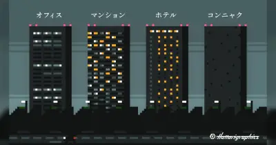マンション、ホテル、コンニャク 夜景のビルの窓をレトロゲーを思わせる低解像度で描いたグラフィックが最後だけなんか違う