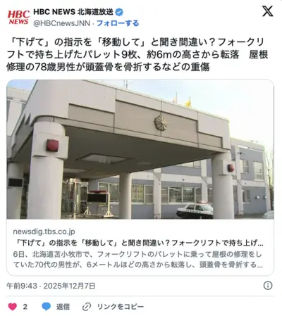 「下げて」指示を「移動して」と聞き間違い? フォークリフトで持ち上げたパレット9枚、6mの高さから転落 屋根修理の男性が頭蓋骨骨折