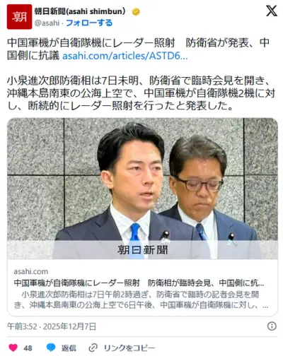 中国海軍の空母艦載機が空自戦闘機に断続的にレーダー照射