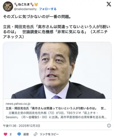 【悲報】立憲民主党「高市早苗が中国に喧嘩売ってるのに何故か国民に支持されてる😢」