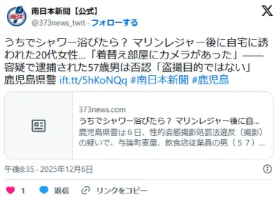 【鹿児島】うちでシャワー浴びたら? マリンレジャー後に自宅に誘われた20代女性「着替え部屋にカメラが…」57歳男「盗撮目的ではない」