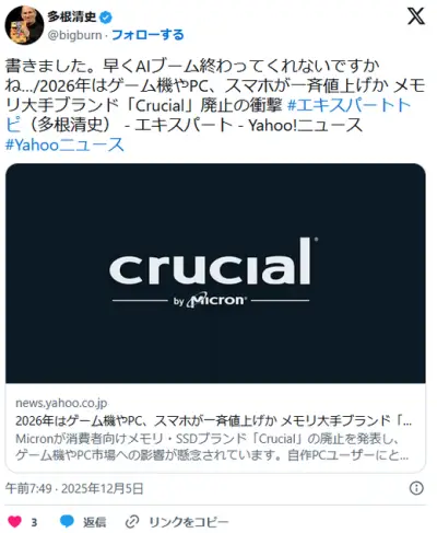 2026年はゲーム機やPC、スマホが一斉値上げか メモリ大手ブランド「Crucial」廃止の衝撃