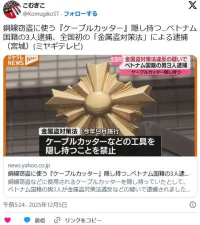 【宮城】銅線窃盗に使う『ケーブルカッター』隠し持つ…グエン容疑者ら3人逮捕、全国初の「金属盗対策法」による逮捕