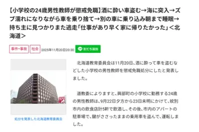 24歳教師、5軒はしご飲酒→車を盗む→道に迷い車水没→ずぶ濡れで別の車に乗り仮眠→持ち主に見つかり逃走 逮捕・懲戒免職