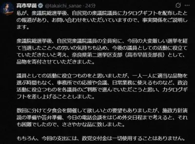 首相、当選祝いでカタログギフト配布 「政党交付金使用せず」と釈明 | 毎日新聞