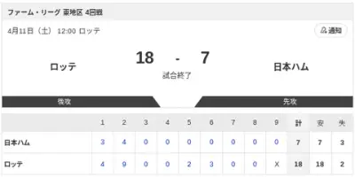 【試合結果】ロッテvs日本ハム2軍 18-7|東地区4回戦|個人成績|4/11
