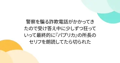 警察を騙る詐欺電話がかかってきたので受け答え中に少しずつ狂っていって最終的に『パプリカ』の所長のセリフを朗読してたら切られた