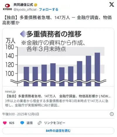 【金融】多重債務者急増、147万人 金融庁調査、物価高影響か