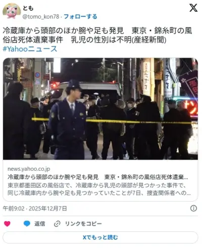 【東京】冷蔵庫から頭部のほか腕や足も発見 錦糸町の風俗店死体遺棄事件 乳児の性別は不明