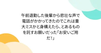 午前退勤した後輩から悲壮な声で電話がかかってきたのでこれは重大ミスかと身構えたら、とあるものを託すお願いだった「お安いご用だ!」