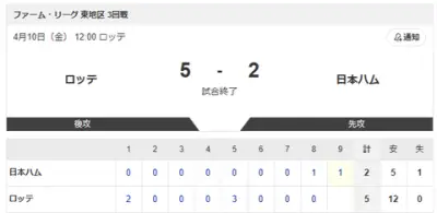 【試合結果】ロッテvs日本ハム2軍 5-2|東地区3回戦|個人成績|4/10