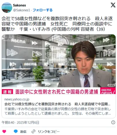 会社で58歳女性顔などを複数回突き刺される 殺人未遂容疑で中国籍の男逮捕 女性死亡