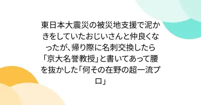 東日本大震災の被災地支援で泥かきをしていたおじいさんと仲良くなったが、帰り際に名刺交換したら「京大名誉教授」と書いてあって腰を抜かした「何その在野の超一流プロ」