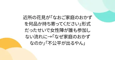 近所の花見が「なおご家庭のおかずを何品か持ち寄ってください」形式だったせいで女性陣が誰も参加しない流れに→「なぜ家庭のおかずなのか」「不公平が出るやん」