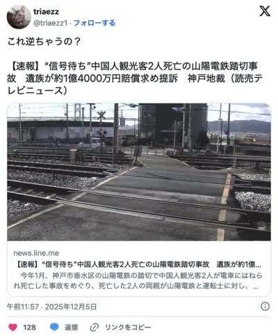 間違って踏切内で電車を待ってしまった中国まんさん2人死亡事故、遺族が約1億4000万円賠償求め提訴