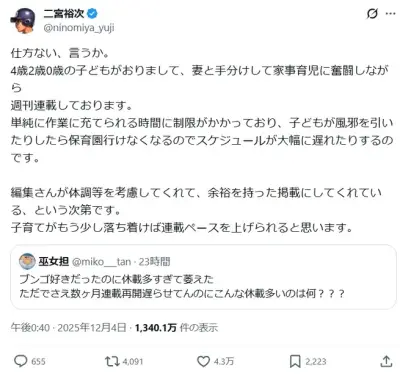 読者「このマンガ休載多すぎ!」作者「3人の子育てしながら連載してるんだが?」