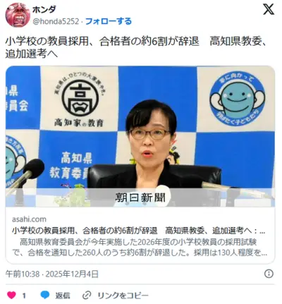 【高知】小学校の教員採用、合格者の約6割が辞退 高知県教委、追加選考へ