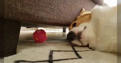 ソファの隙間にはいってしまったボールがどうしてもとりたいコーギー、なぜか全然届かない「一瞬惜しかったのに!」