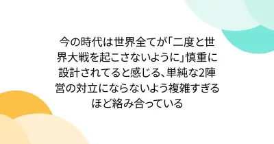 今の時代は世界全てが「二度と世界大戦を起こさないように」慎重に設計されてると感じる、単純な2陣営の対立にならないよう複雑すぎるほど絡み合っている