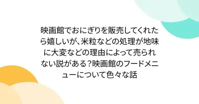映画館でおにぎりを販売してくれたら嬉しいが、米粒などの処理が地味に大変などの理由によって売られない説がある?映画館のフードメニューについて色々な話