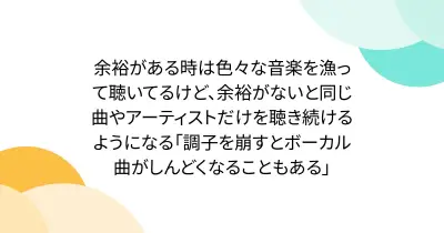 余裕がある時は色々な音楽を漁って聴いてるけど、余裕がないと同じ曲やアーティストだけを聴き続けるようになる「調子を崩すとボーカル曲がしんどくなることもある」