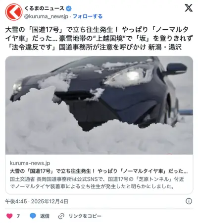 ノーマルタイヤ車、新潟の雪道で立ち往生