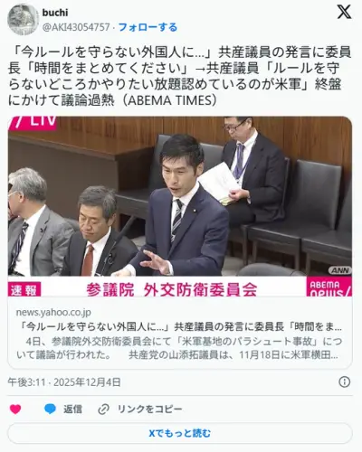 【正論】共産党若手ホープ山添拓議員「一番ルールを守っていない在日外国人は米軍です!指導すれば?」