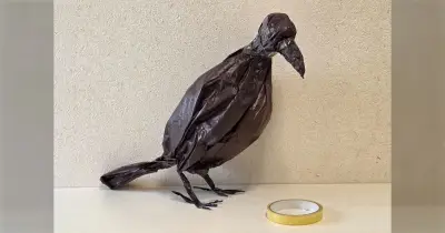 レジ袋1枚とセロテープで作ったカラスのクオリティが凄い→ベランダに吊るしたら鳩避けに効果が「何と実生活に役立つ才能か」