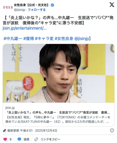 中丸雄一 生放送で“ババア”発言が波紋「炎上狙いかな?」「ガッカリした」「その路線で行くことに?」