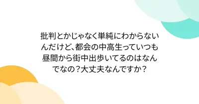 批判とかじゃなく単純にわからないんだけど、都会の中高生っていつも昼間から街中出歩いてるのはなんでなの?大丈夫なんですか?