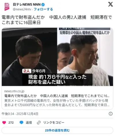 電車内で財布盗んだか 中国人の男2人逮捕 短期滞在でこれまでに16回来日