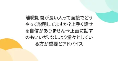 離職期間が長い人って面接でどうやって説明してますか?上手く話せる自信がありません→正直に話すのもいいが、なにより堂々としている方が重要とアドバイス
